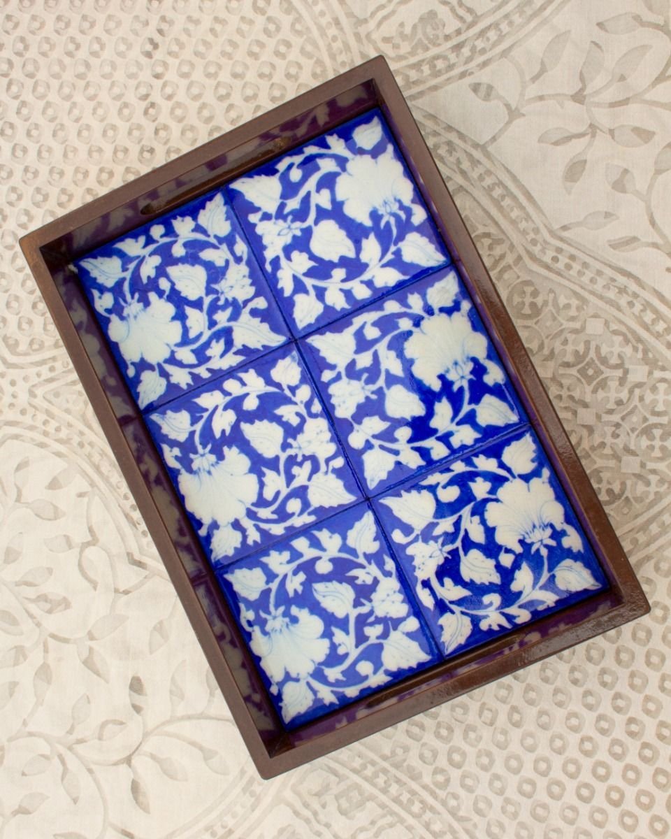 Lovely blue pottery handcrafted tray, decorated with bright colours in the beautiful design. This is a perfect choice for home décor and can be used to serve tea, coffee, and other food items. This cute tray can also be gifted at housewarming parties.